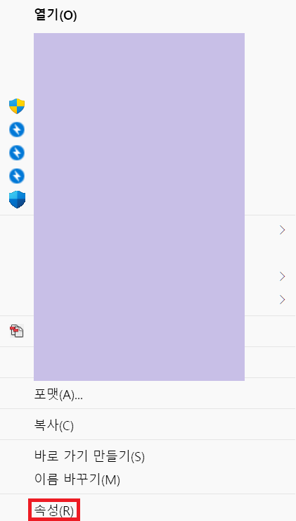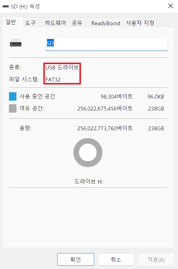 SD카드 드라이브(H:)에 마우스 우클릭해서 뜨는 메뉴에서 속성 선택.