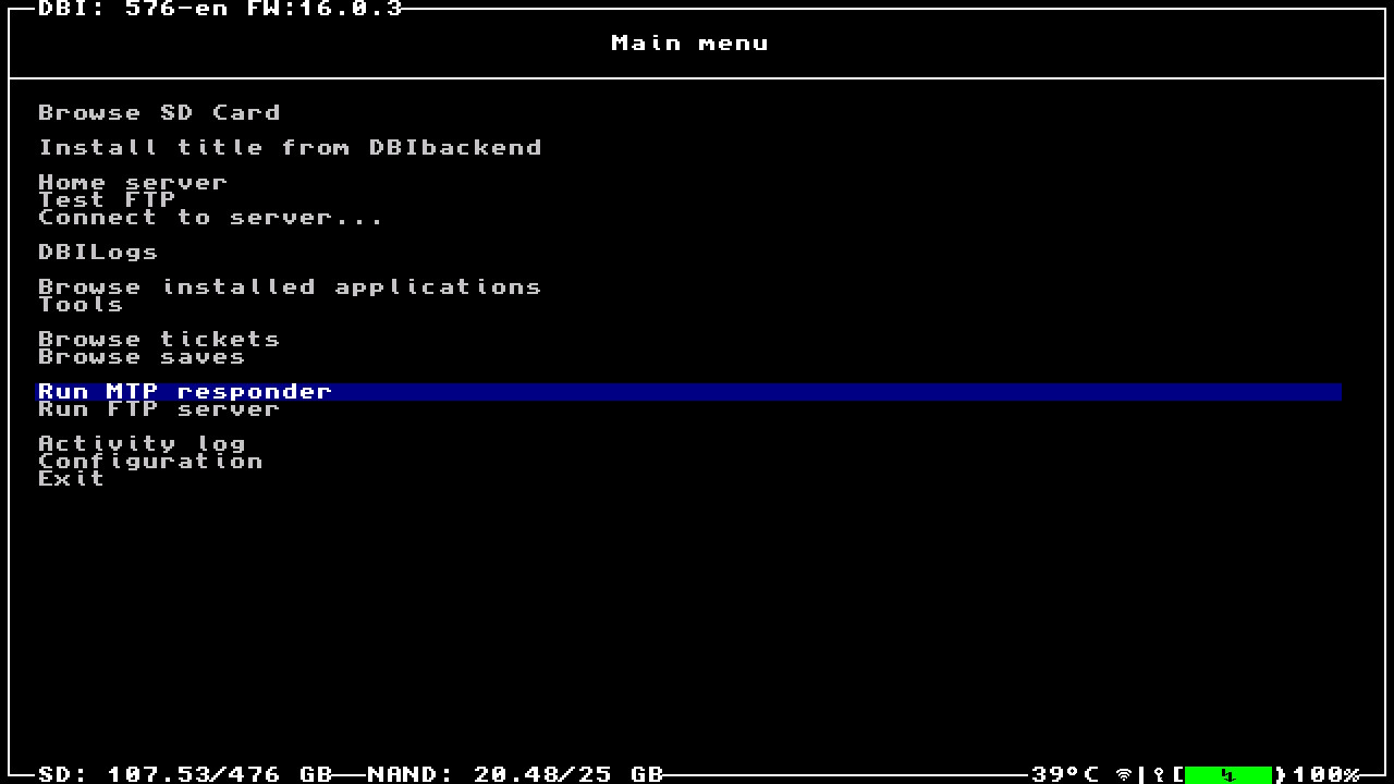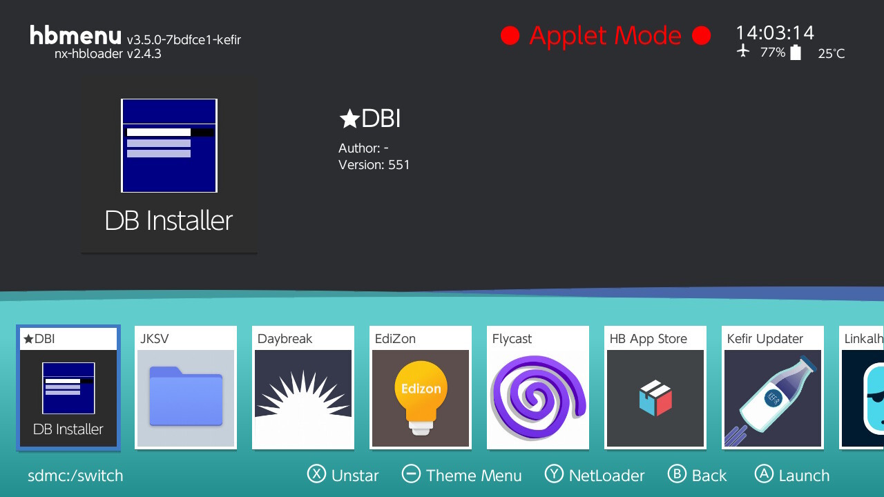 hbmenu 설치 방법입니다. 케피르 기준으로 설명합니다. 앨범에서 R1+a 버튼을 눌러줍니다. 앨범이 Applet Mode로 떴네요. DBI (DB Installer)을 A버튼을 눌러서 실행합니다. 첫번째 메뉴인 Browse SD Card 를 선